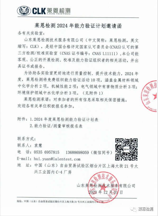 關(guān)于2024年度萊恩檢測(cè)組織能力驗(yàn)證項(xiàng)目的邀請(qǐng)